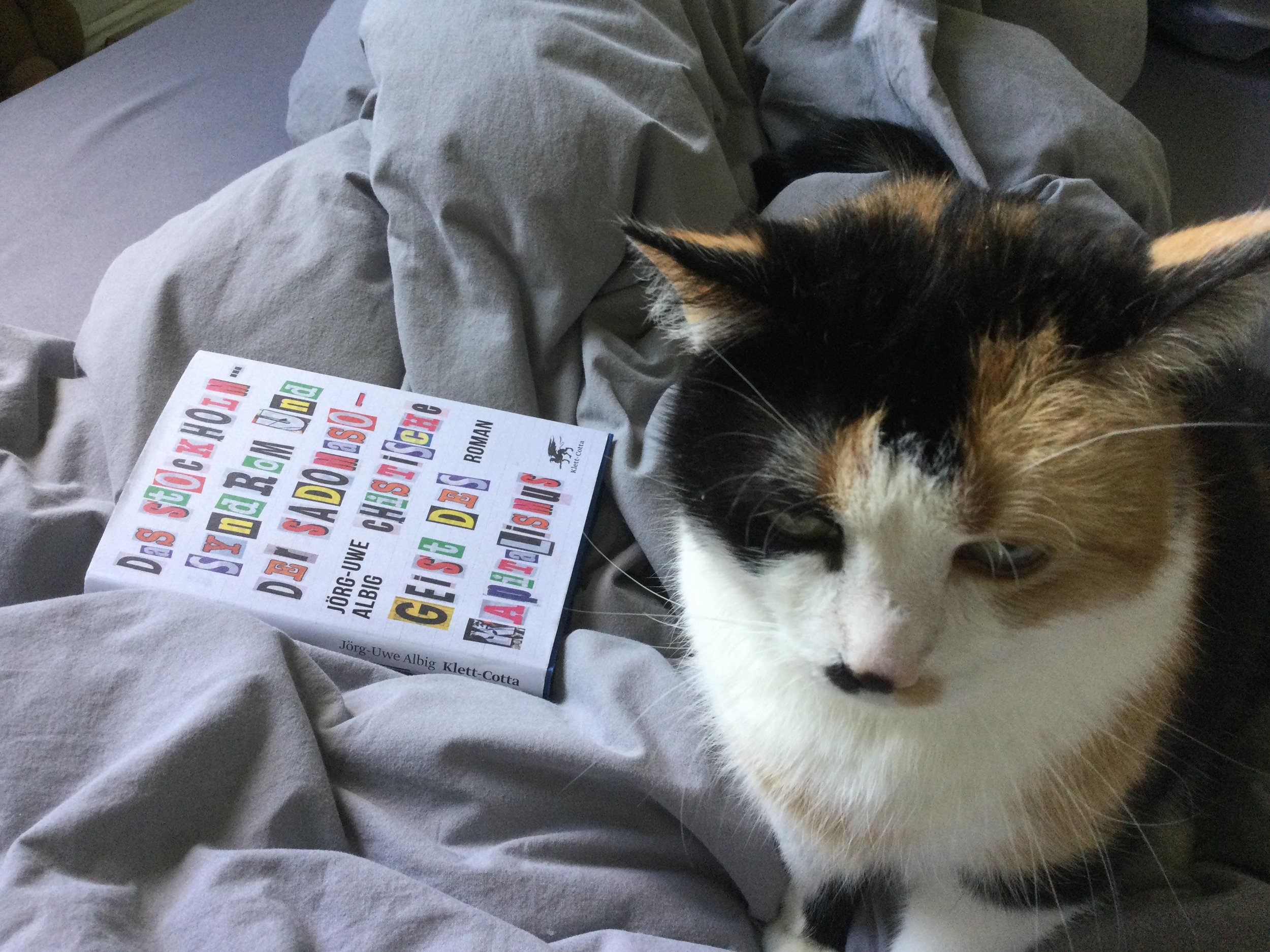Ein Buch mit buntem Schriftzug auf einem Bett neben einer dreifarbigen Katze.