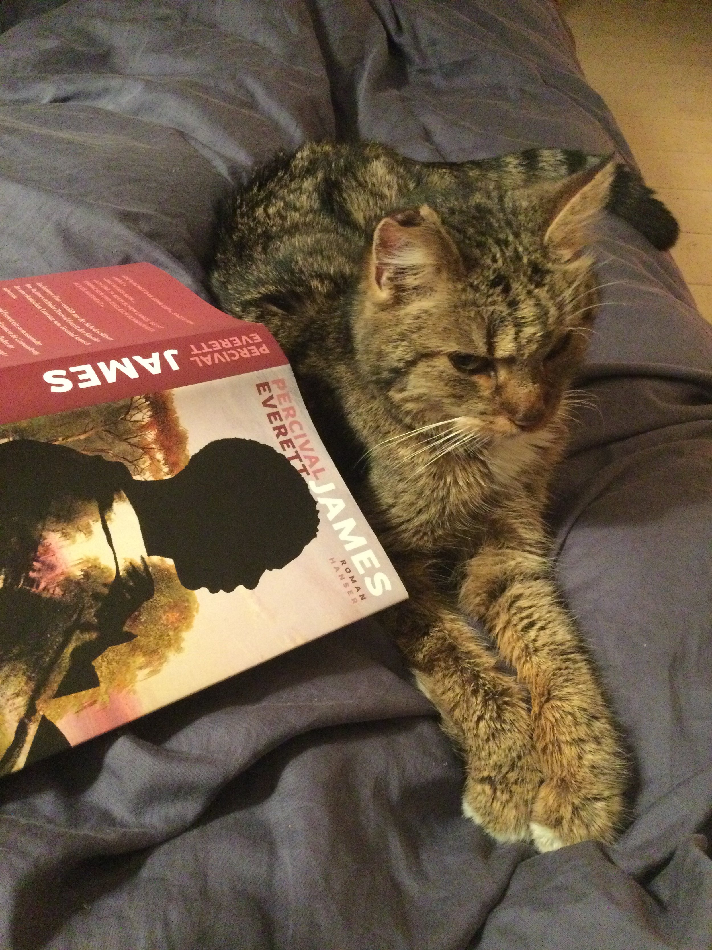 Eine getigerte Katze liegt auf einer Decke neben einem Buch, das Titel und den Namen Percival Everett zeigt.