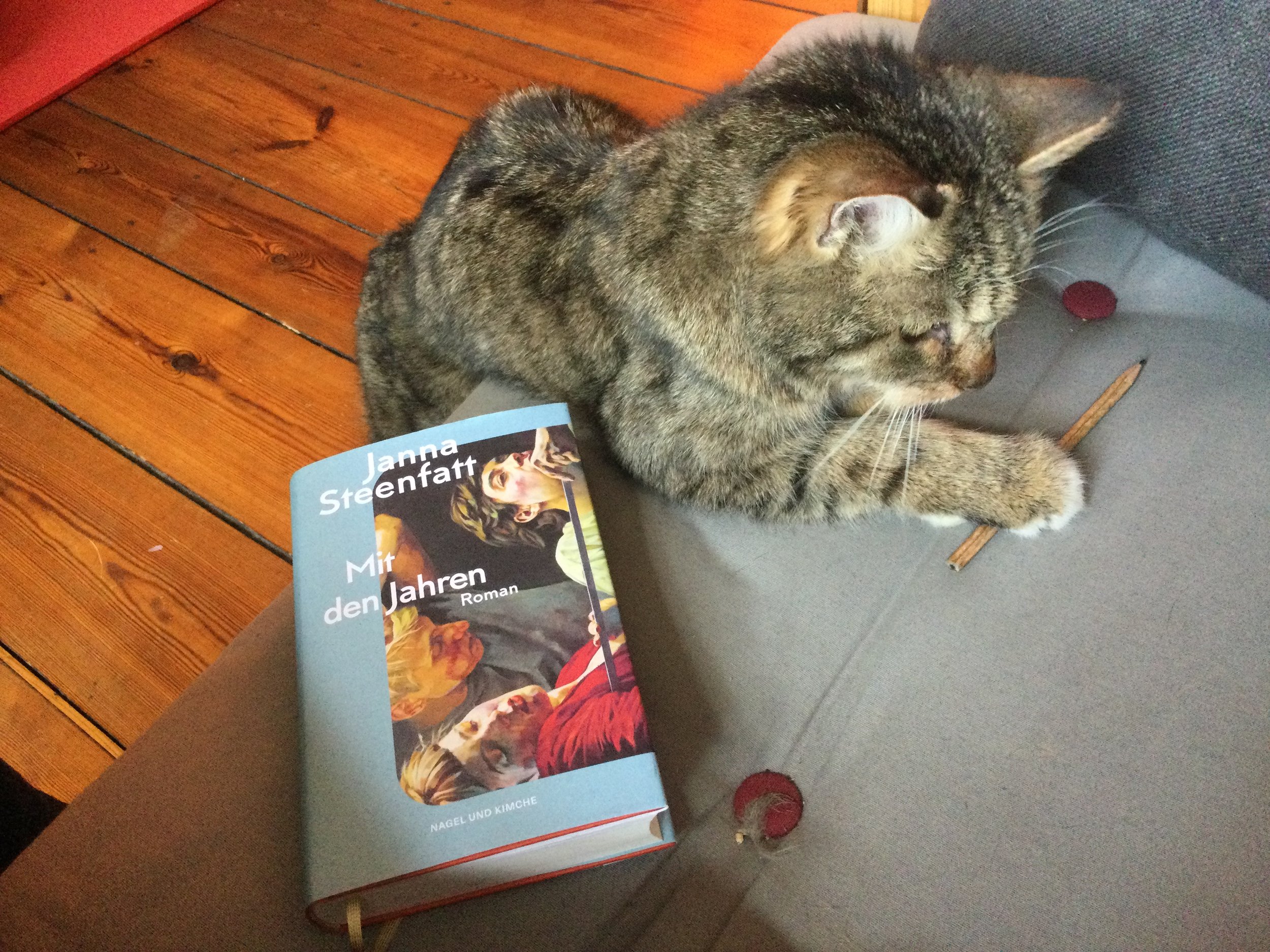 Getigerte Katze liegt auf einem grauen Sofa neben einem Buch mit dem Titel 'Mir den Jahren' von Janna Steenfatt und einem Bleistift. Der Boden ist aus Holz.