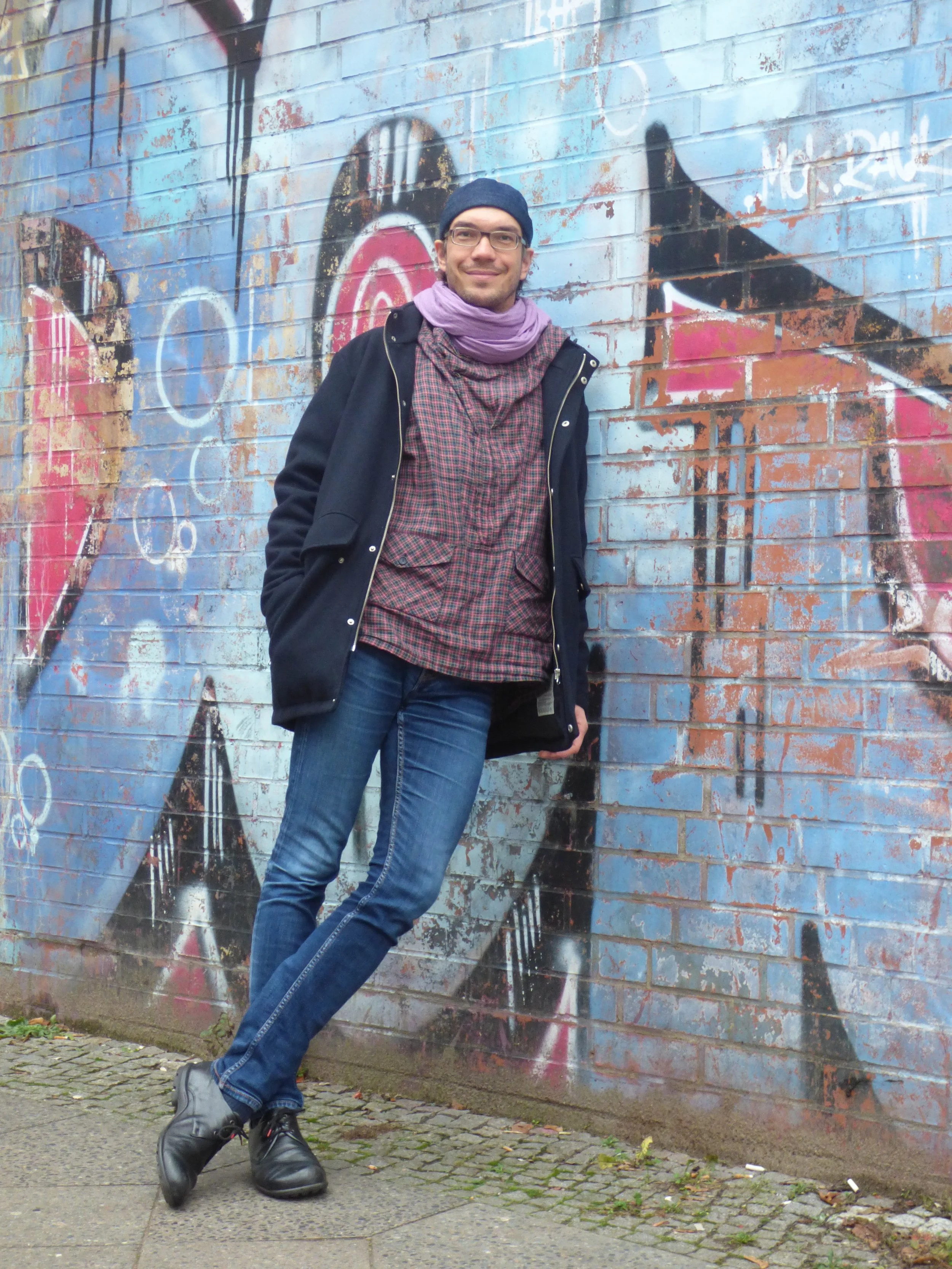 Person lehnt an einer Wand mit Graffiti, trägt eine Mütze, Schal, dunkle Jacke, karierte Hemd und Jeans. Pflastersteine am Boden.